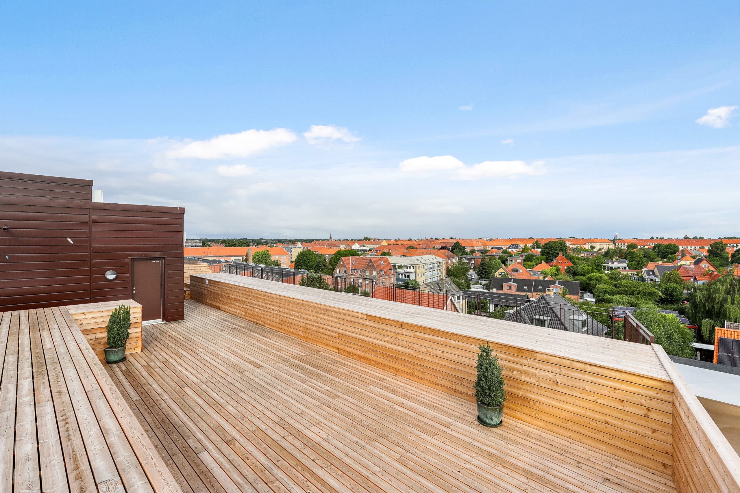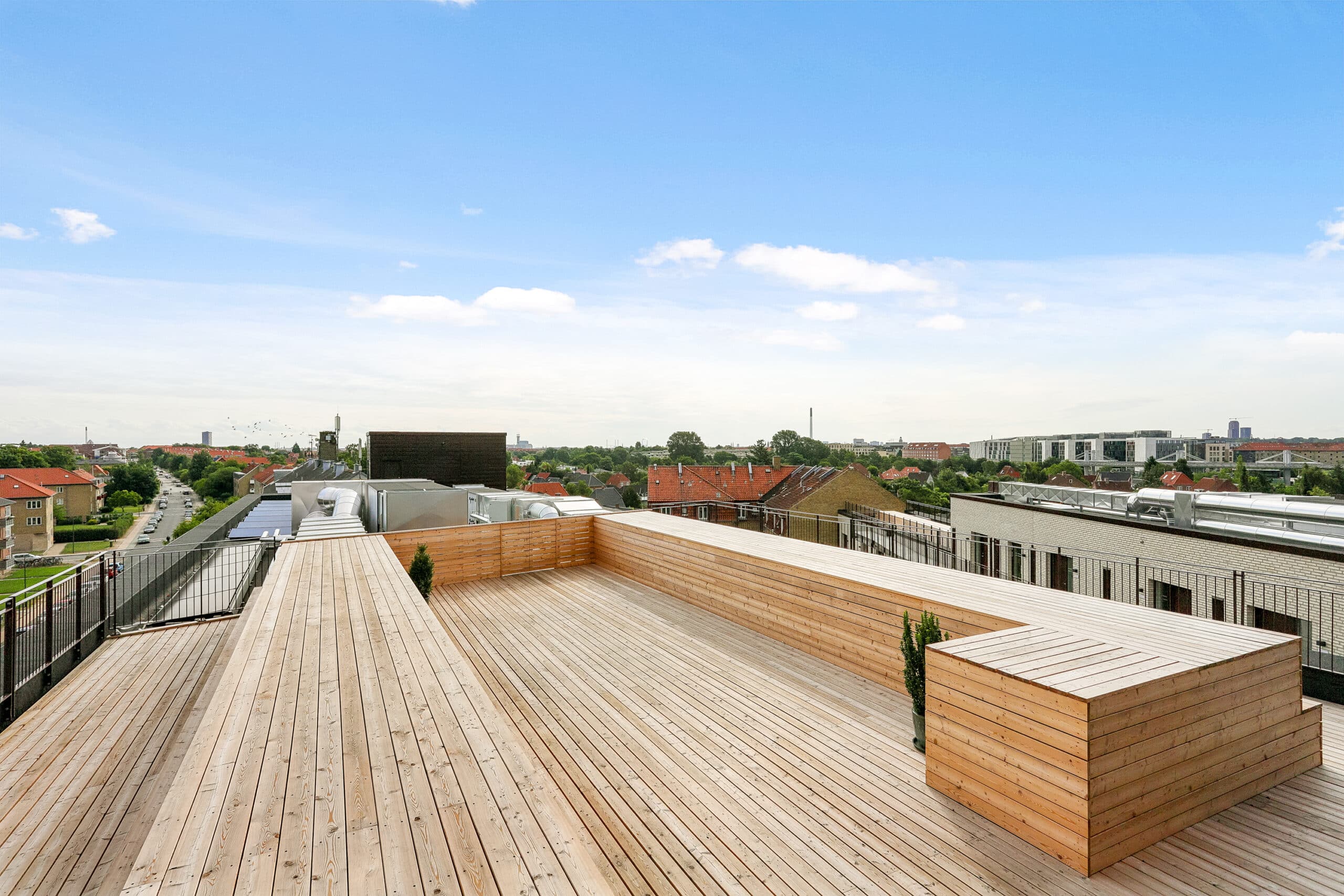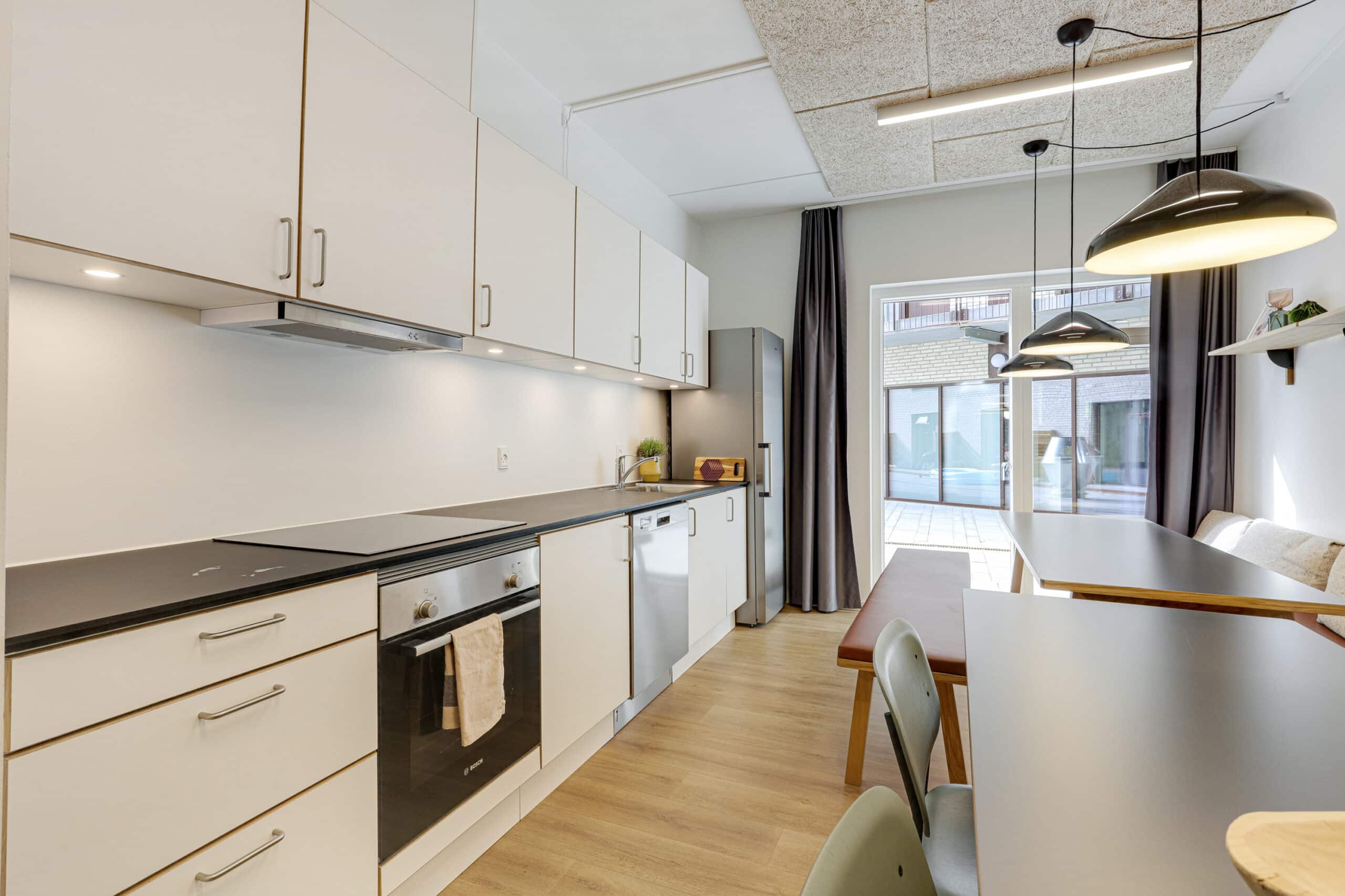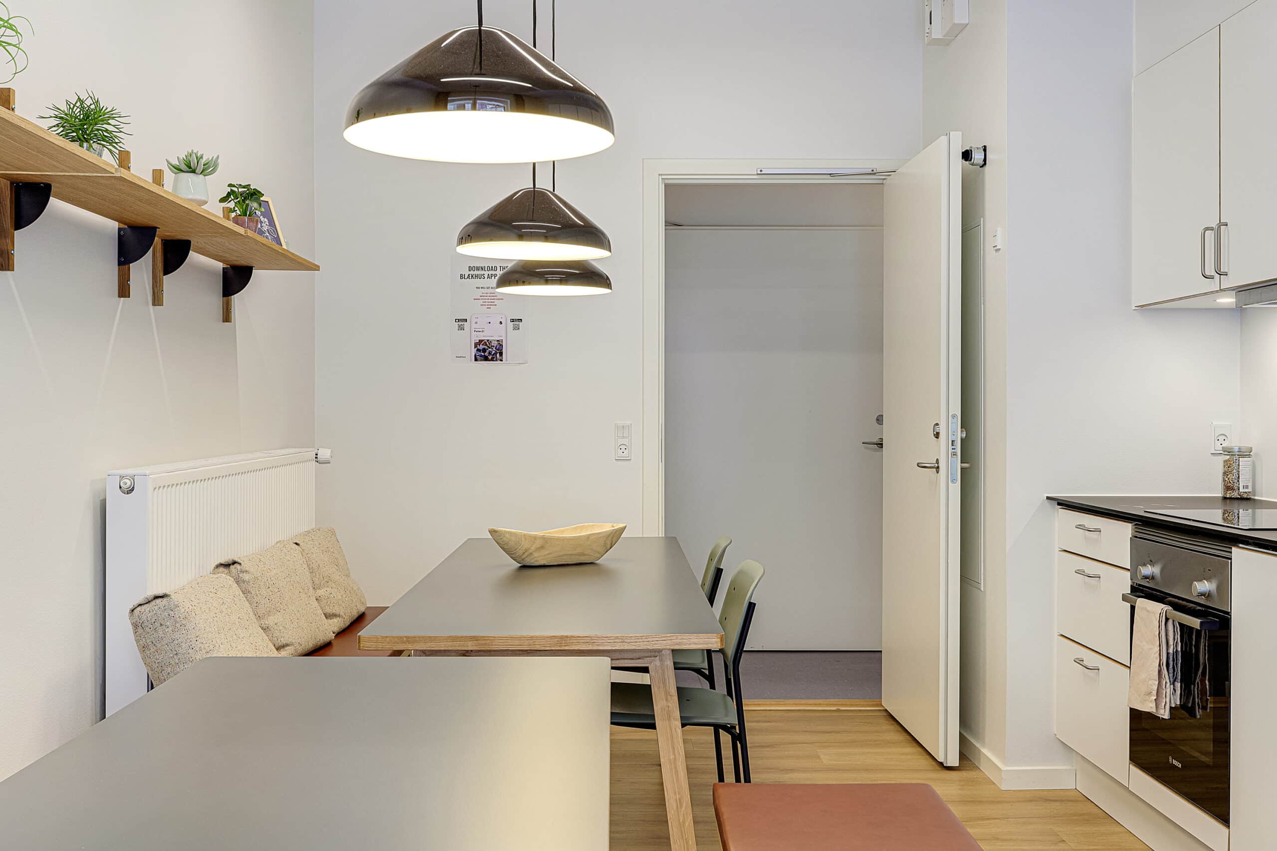 Øverst i bygningen finder du en rummelig tagterrasse med møblerede loungeområder, hvor du kan nyde solen, holde små sammenkomster eller bare tage en pause fra studierne med udsigt over byens tage. Hver etage er udstyret med moderne fælleskøkkener, som inviterer til fælles madlavning og hyggelige måltider i selskab med dine naboer.